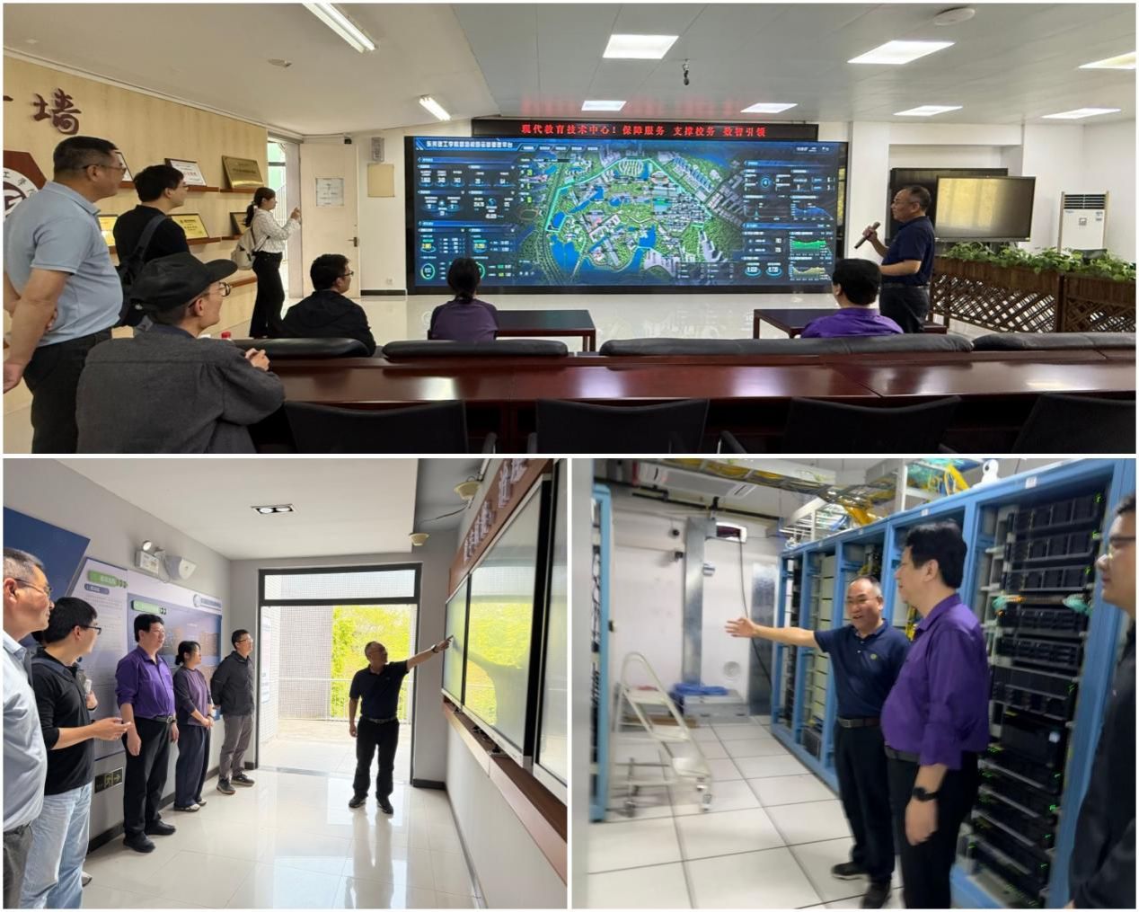 座谈结束后,调研团实地参观了智慧校园运营管理平台(IOC),直观了解平台基于数字孪生、大数据、物联网等技术实现的校园态势可视化感知、业务全流程智能化监管功能,给调研团留下了深刻印象。随后,调研团一行还走访了数据机房,深入了解机房基础设施建设、数据安全保障措施等运行情况。