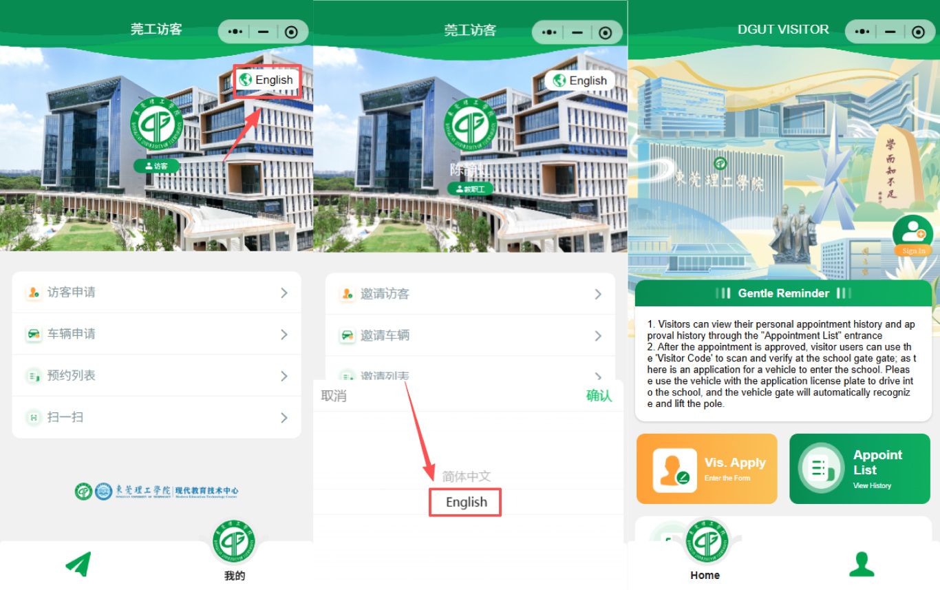 访客系统紧密结合学校国际化战略目标与校园安全管理现实需求,支持中英双语,切换方法如下: