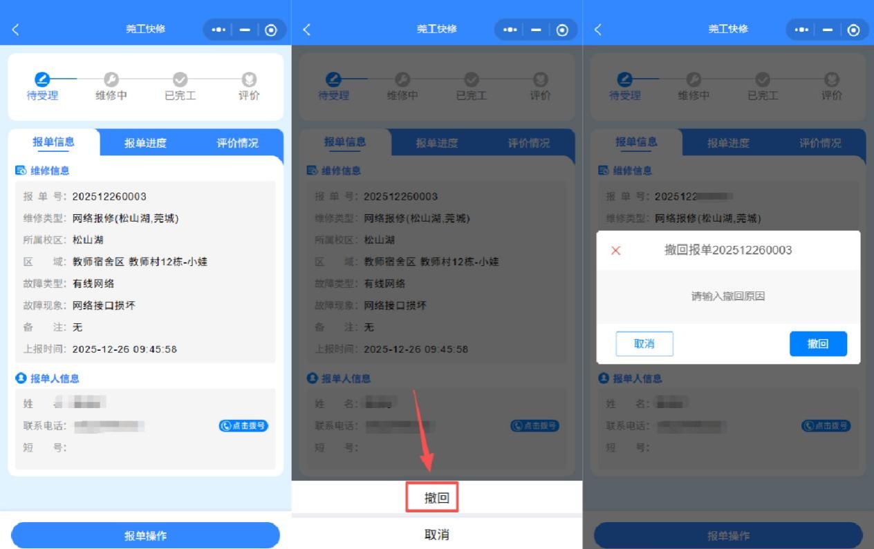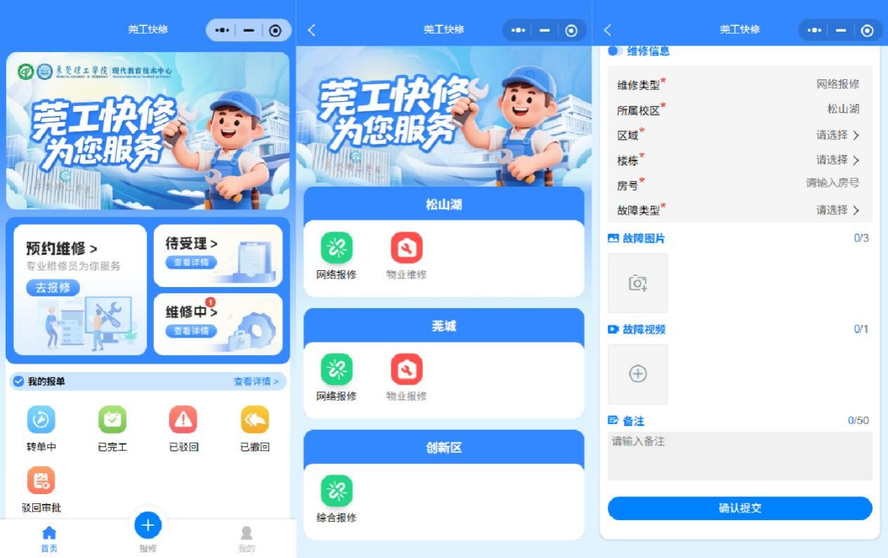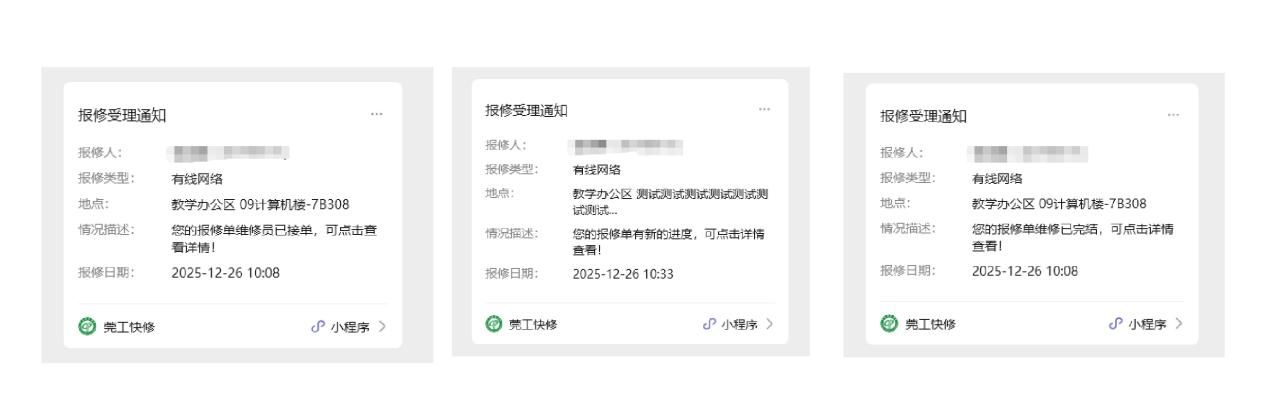 当运维人员处理用户的报修后,小程序也会通过智慧莞工公众号推送有关进度信息。