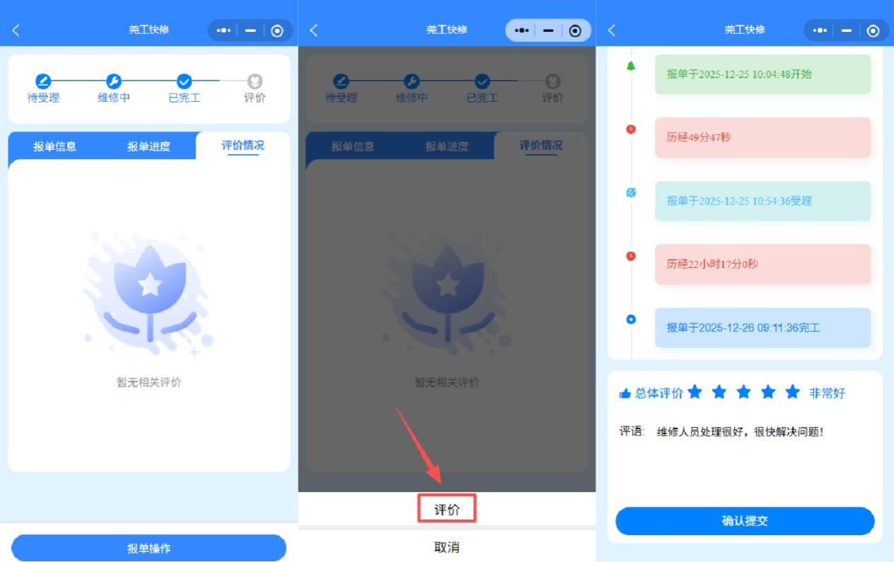 维修工作完成后,用户可对维修情况进行评价。若在一定时间内不评价,小程序将会进行自动评价。