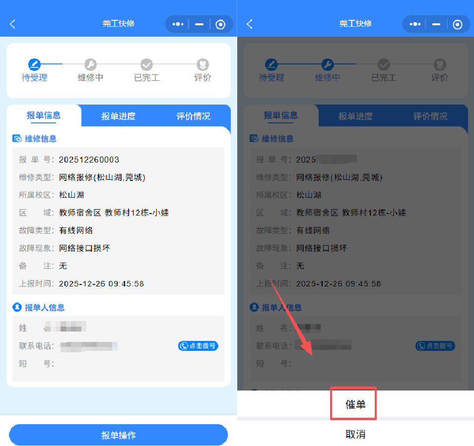 如运维人员在报修单发起1小时内没有处理故障,用户可进行催单,小程序会实时推送通知消息给运维人员。
