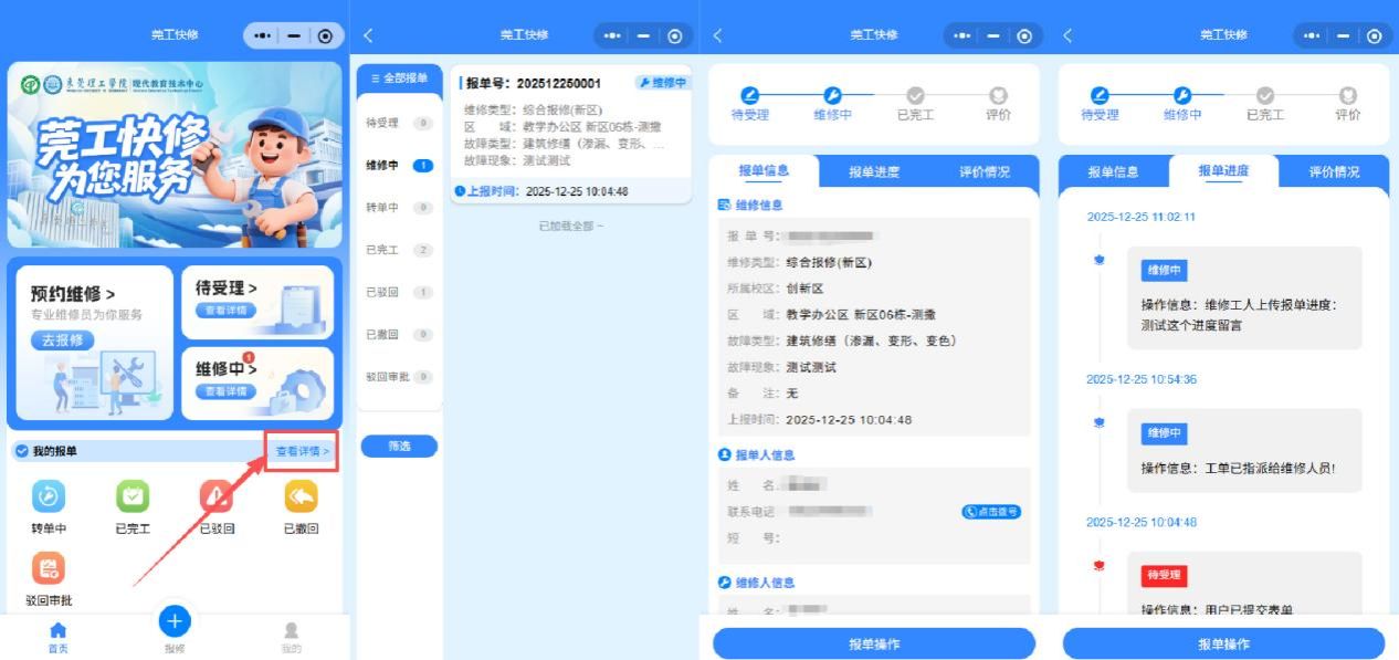 1.点击首页的查看详情,可查看所有上报的报修单。
