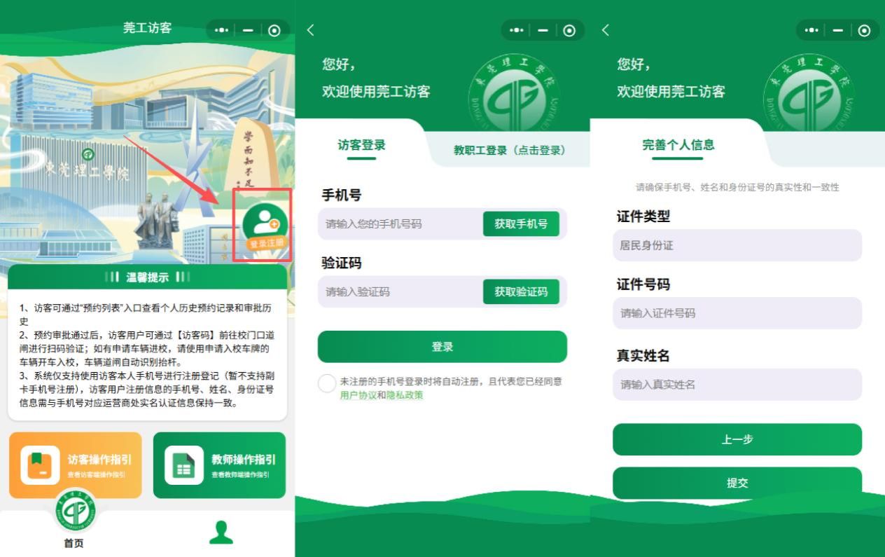 2、注册访客账号,手机号、姓名和身份证号须真实、一致。