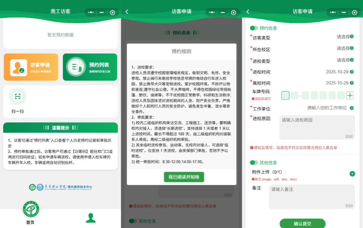 因学校安全管理办法要求,访客进校前需进行预约进校申请才可进,可前往“莞工访客”小程序预约进校。